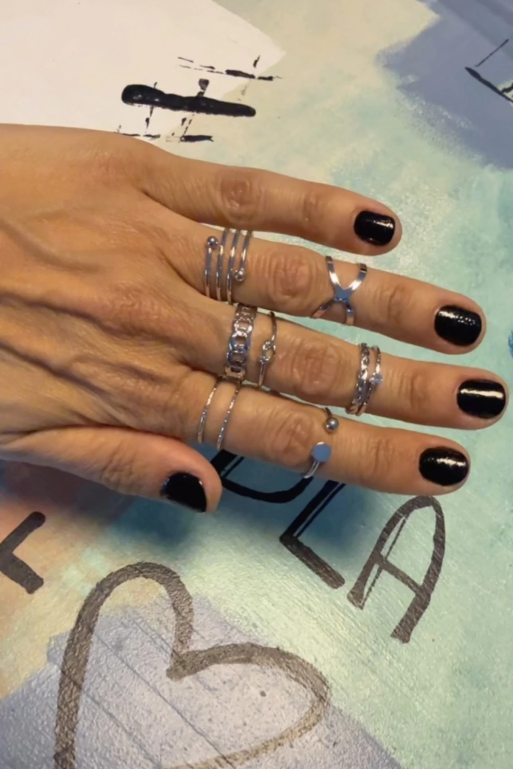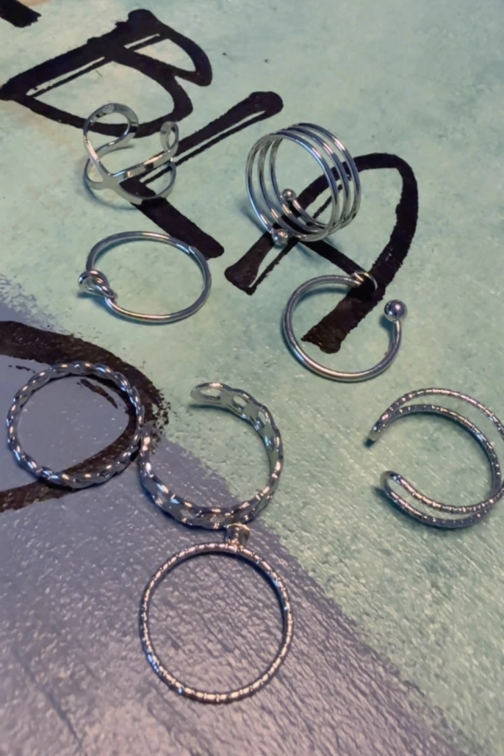 Set de 8 anillos, de distintas formas y medidas para usar en los distintos dedos. Divinos para lookear los basicos E.