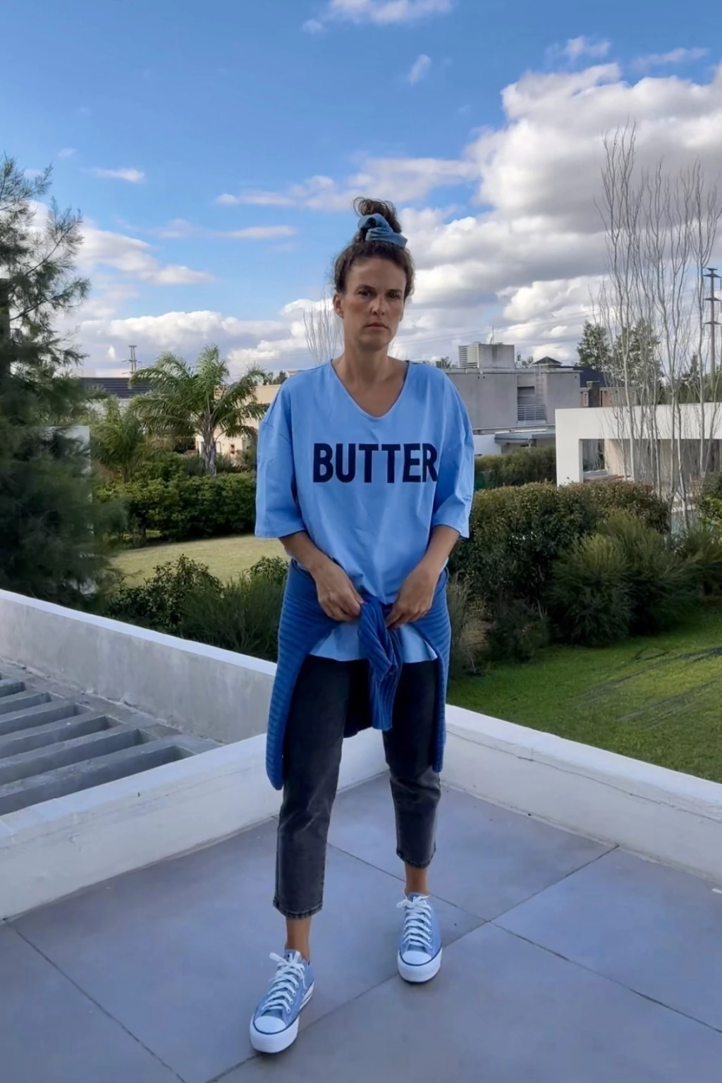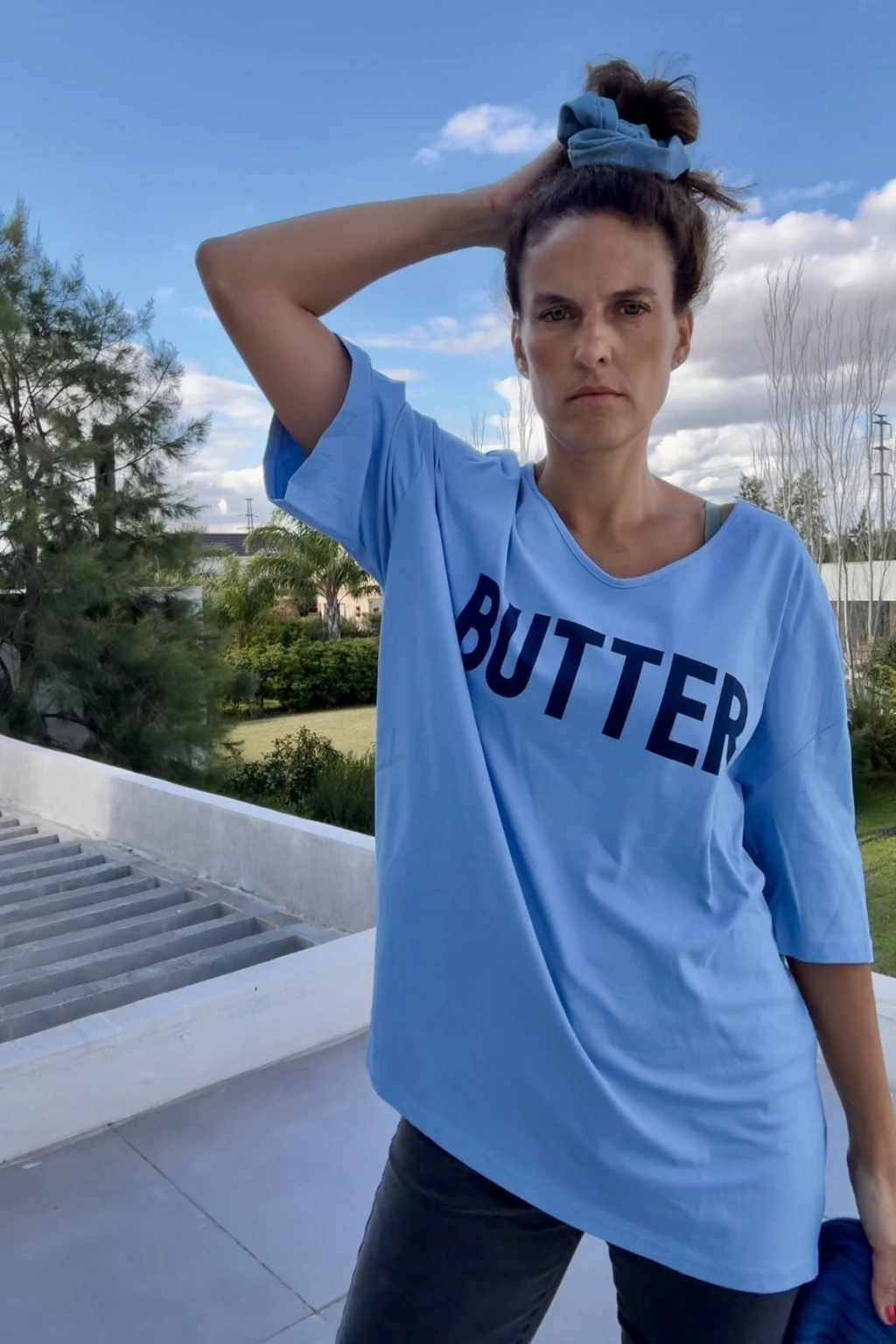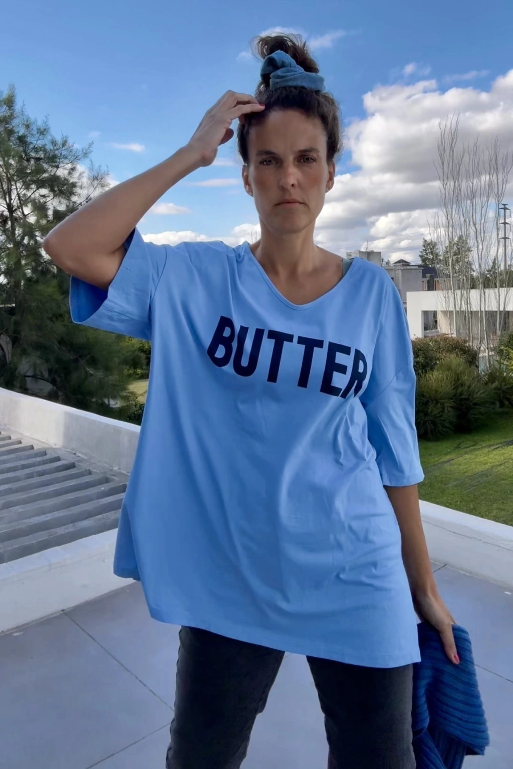 Remeron oversize, 100% algodon, con estampa BUTTER! Toda la onda este remeron. Tiene aberturas en los costados. Cuello V. Nada mas comodo que estar como uno quiere. AMAMOS SU ONDA🔝